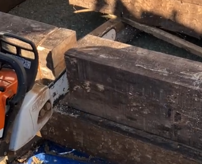 チェンソーの音、木の香り、粉塵が光に舞う感じ。