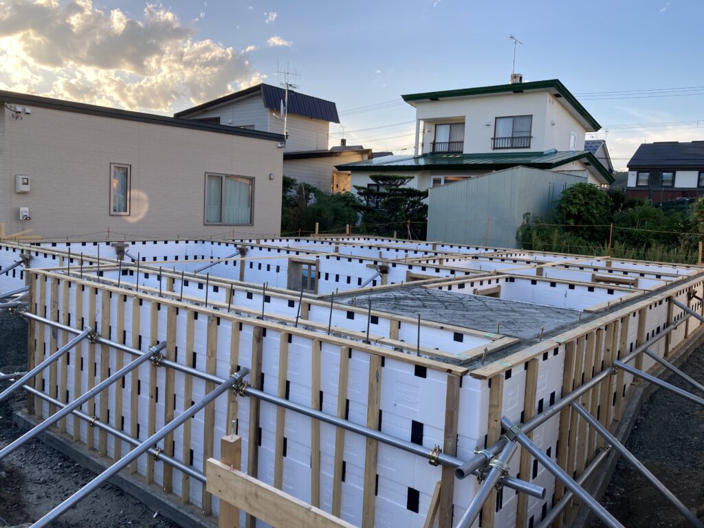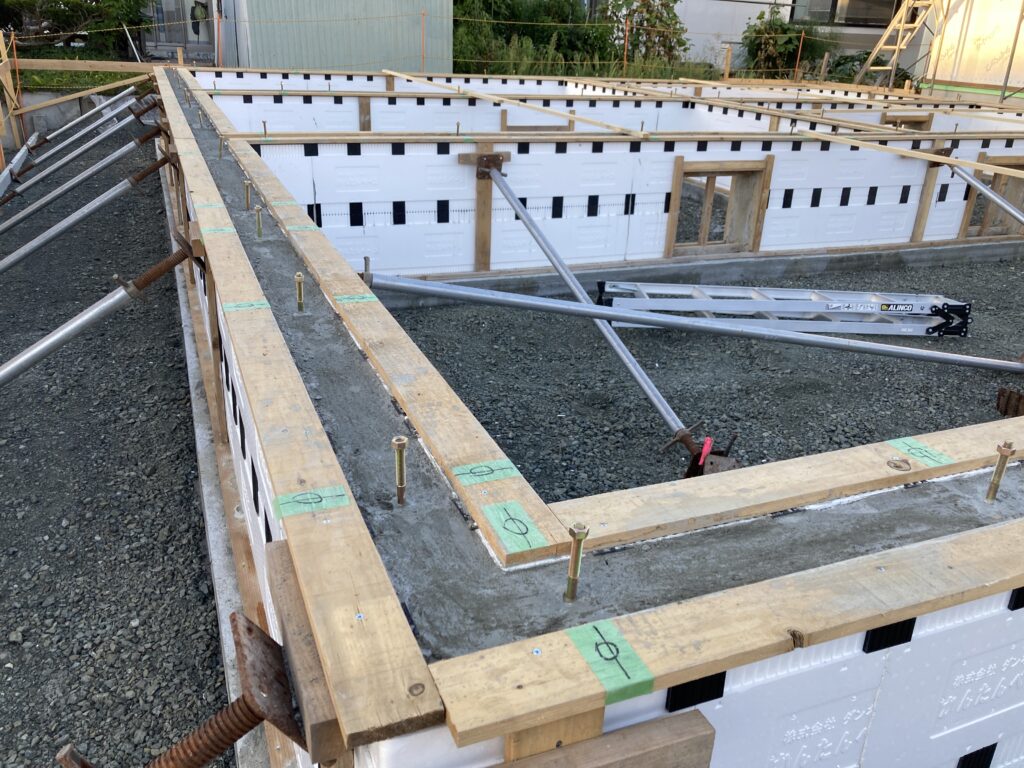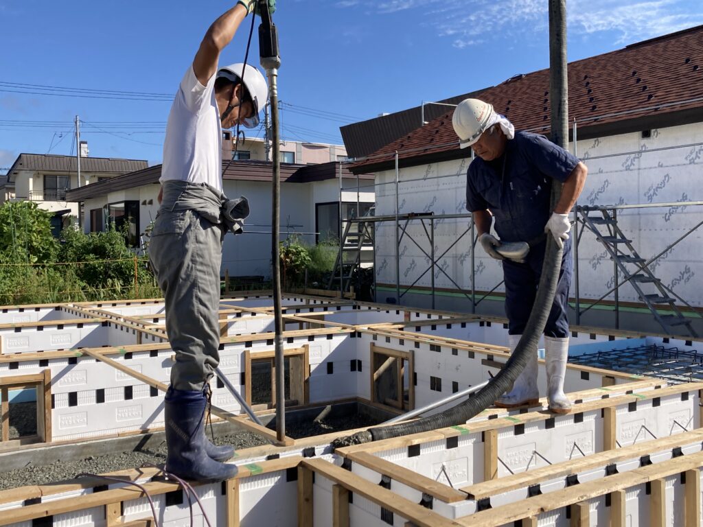 スムーズに生コン打設が完了し硬化前に天端をならしますが、まだ夏の太陽がコンクリート硬化と体の発汗を促進してくれます。