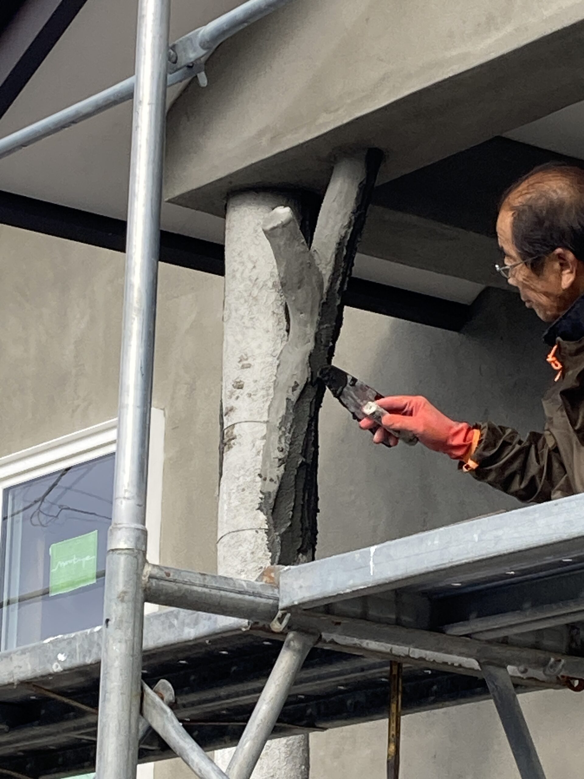 「擬木」といわれる造形左官の技術ですが、現在オホーツク管内でこの作業ができる左官職人は1人だけでしょうね。