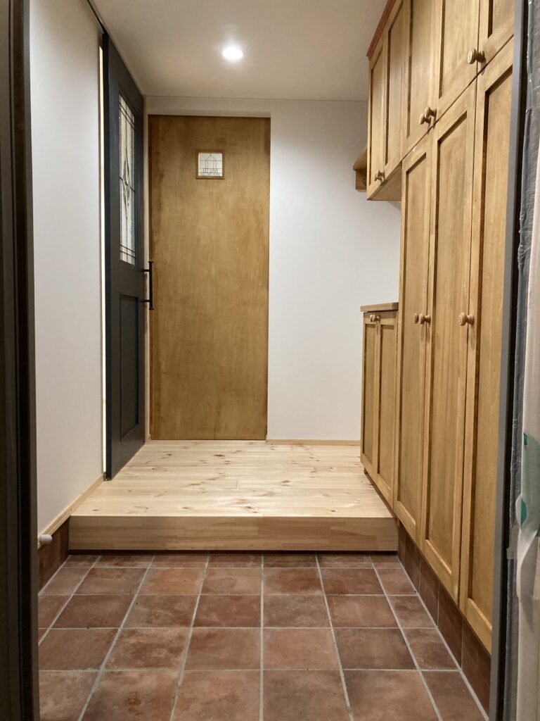 ヒノキの超断熱玄関ドアを開けると、テラコッタ調タイルと無垢フローリングの素材にしっくりと馴染む自然塗料で仕上げられた、世界に1枚しかないオリジナル建具です。