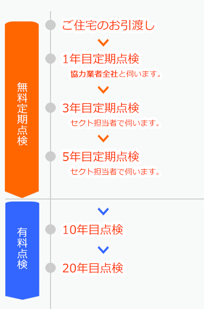 特に、お引渡し1年目の定期点検では、協力会社の全社とともにお伺いし、より細やかなチェックとフォローを行います。